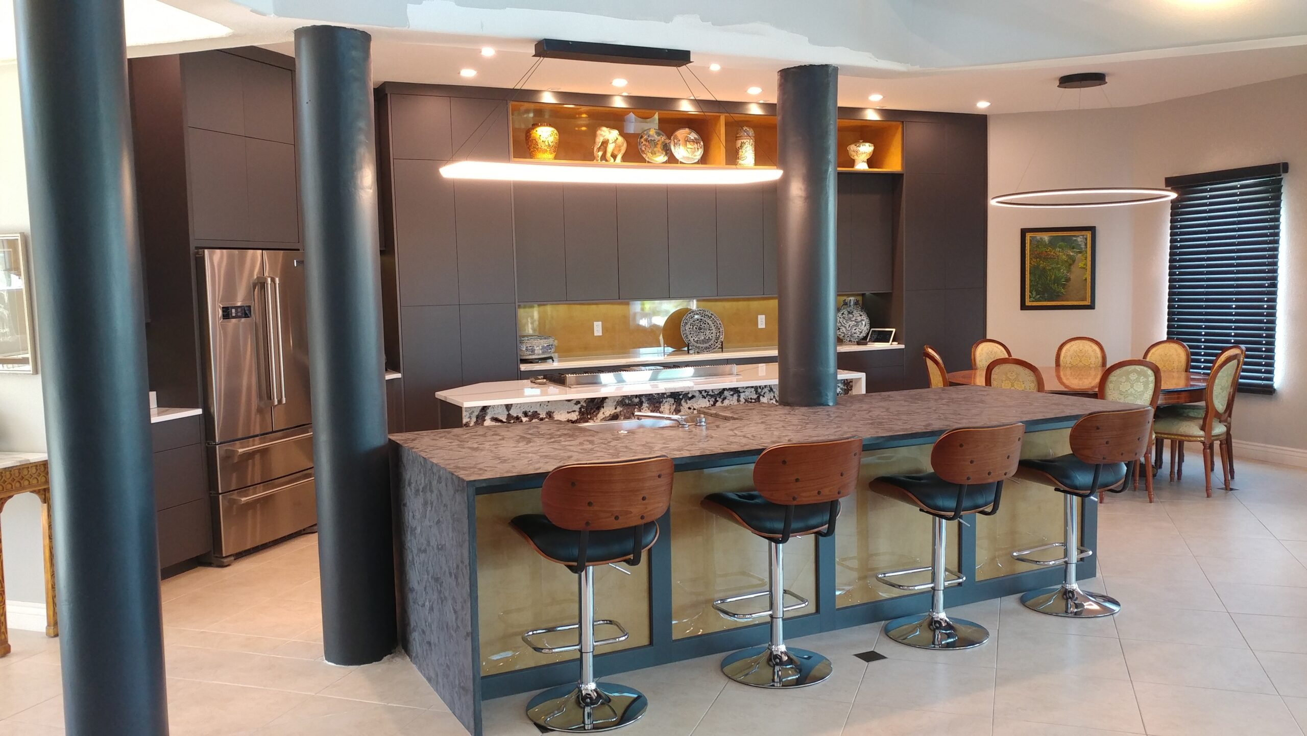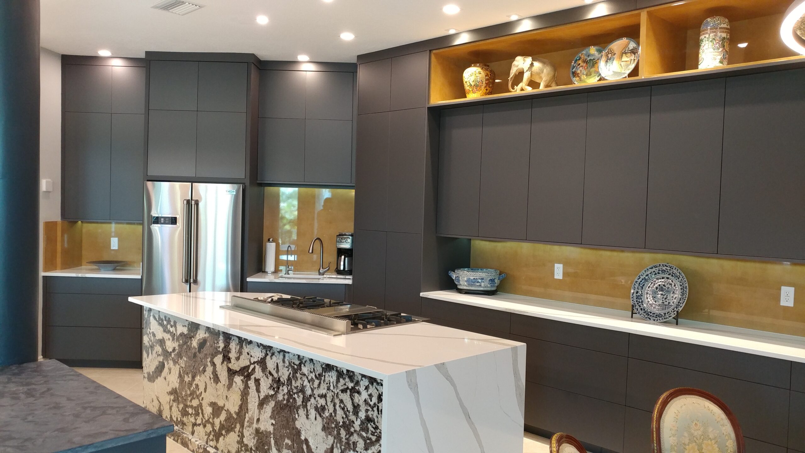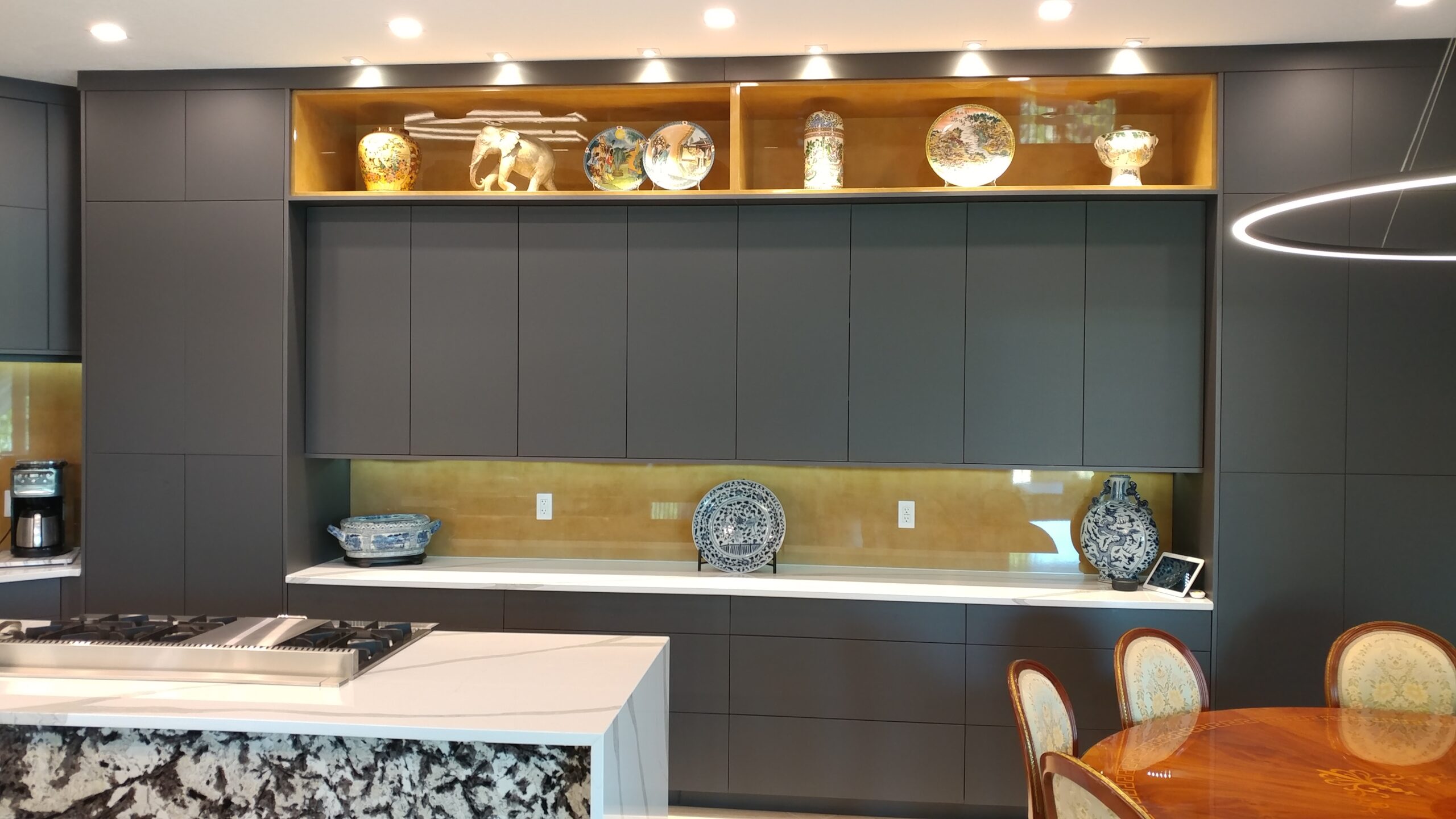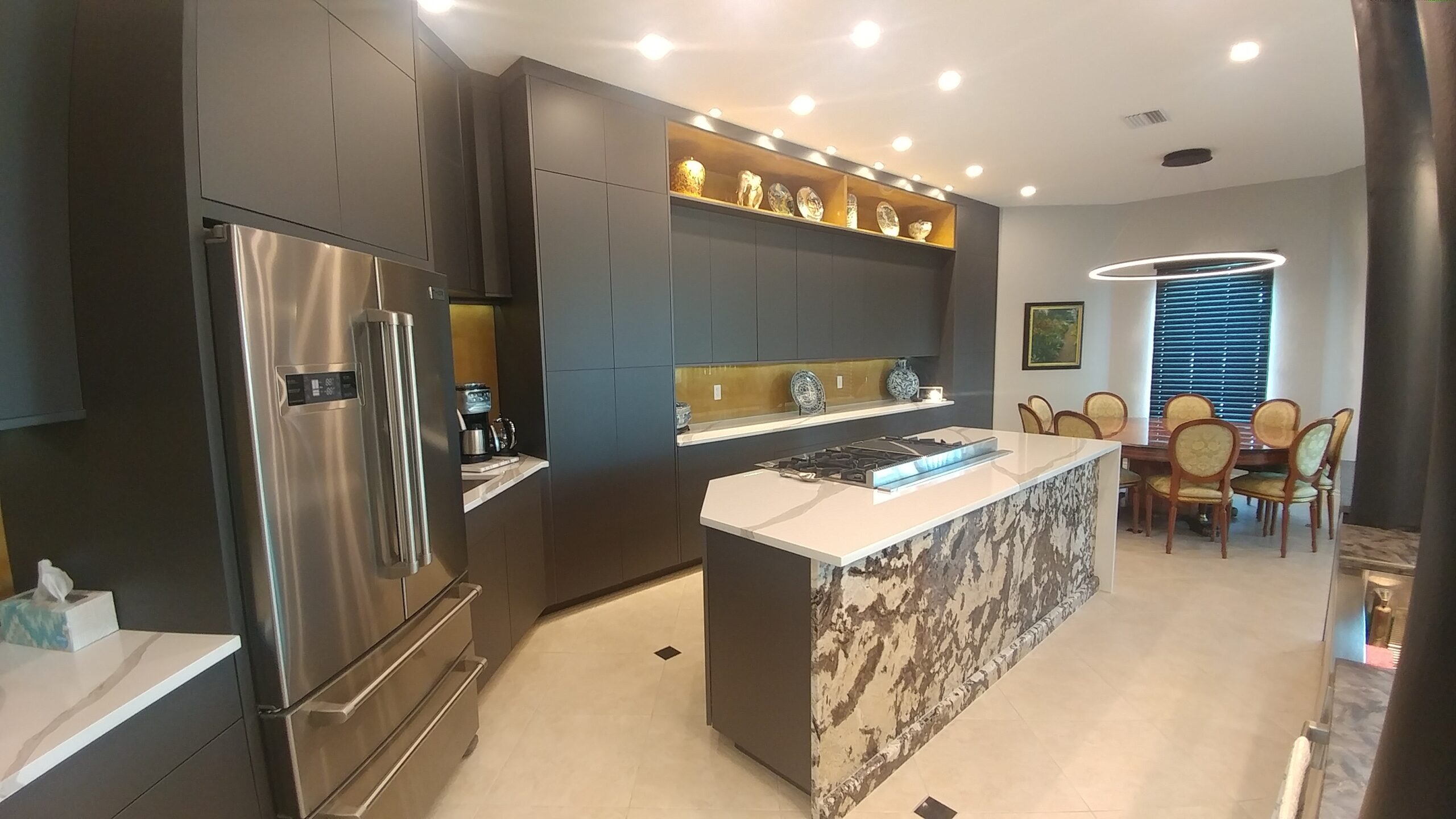 A while back, we took on the design challenge of a dated kitchen full of angles and an island top already in place. These photos are of our creation (executed by another contractor). Today He was kind enough to invite us back to see the almost completed project and it is absolutely stunning in person! Bye bye white shaker – Matte Black is Trending!
